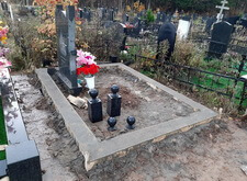 Завершающим этапом стала сборка оградки и укладка брусчатки. Ограждение мы создали из находившихся на могиле секций, кое где закрепив отломавшиеся навершия на разделительные столбики. Перед памятником мы установили гранитный цветник и две траурные урны, а по правую сторону от входа поставили заказанную клиентом лавочку, тоже изготовленную из чёрного гранита. Брусчатку мы замыли водой, одновременно удаляя всю строительную пыль, образовавшуюся в процессе работы.